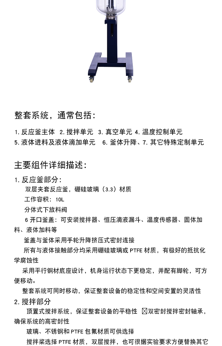 旋轉升降型雙層玻璃反應釜是雙層玻璃反應釜的一種高級功能變型。它在標準雙層釜的基礎上,增加了一套可使整個反應釜主體(玻璃部分)進行旋轉和升降的機械結構。這一設計極大地提升了設備的操作便捷性、安全性和功能功能性,尤其適用于需要頻繁投料、清洗或進行固液反應的場景。通過巧妙的機械設計,解決了傳統反應釜在操作性和安全性上的痛點。它雖然比固定式反應釜價格更高,但其帶來的效率提升、安全保證和設備壽命延長,使其成為許多現代化實驗室、特別是研發和中試環節的首選設備。